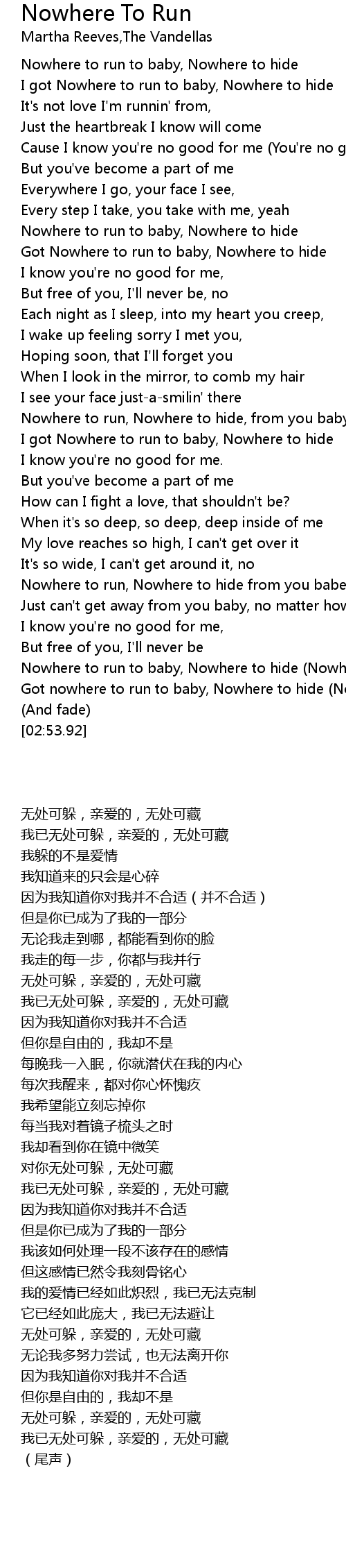 Get 10 Nowhere To Run Lyrics. Got nowhere to run to, baby, nowhere to hide. Got nowhere to run to, baby, nowhere to hide. Lyrics for nowhere to run by toxic holocaust. Paroles de nowhere to run par always never, life is a moment you blink and it's over the hardest days are yet to come the shadows in my home. It's not love, i'm a running from, it's the heartbreak i know will come.